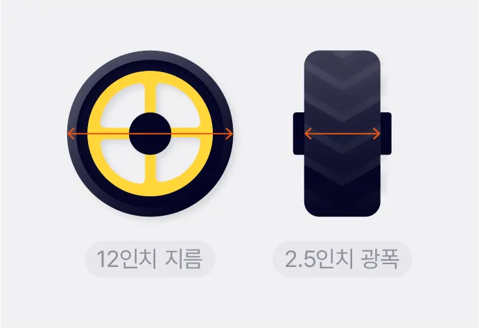 오르막길, 굽은길, 좁은길 어디든 마음놓고 자유롭게 이동하세요. 무려 12인치 지름으로 넓어진 앞바퀴와 2.5인치의 광폭 타이어가 적용된 뒷바퀴는 부드러운 주행감을 선사합니다. 또한 6인치로 넓어진 발판은 안정적인 자세로 주행이 가능합니다.