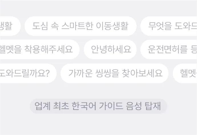 공유 킥보드 업체 최초로 도입한 씽씽만의 한국어 음성 시스템으로 대여와 반납, 주행에 필요한 모든 이용 가이드를 쉽고 빠르게 안내받으세요.