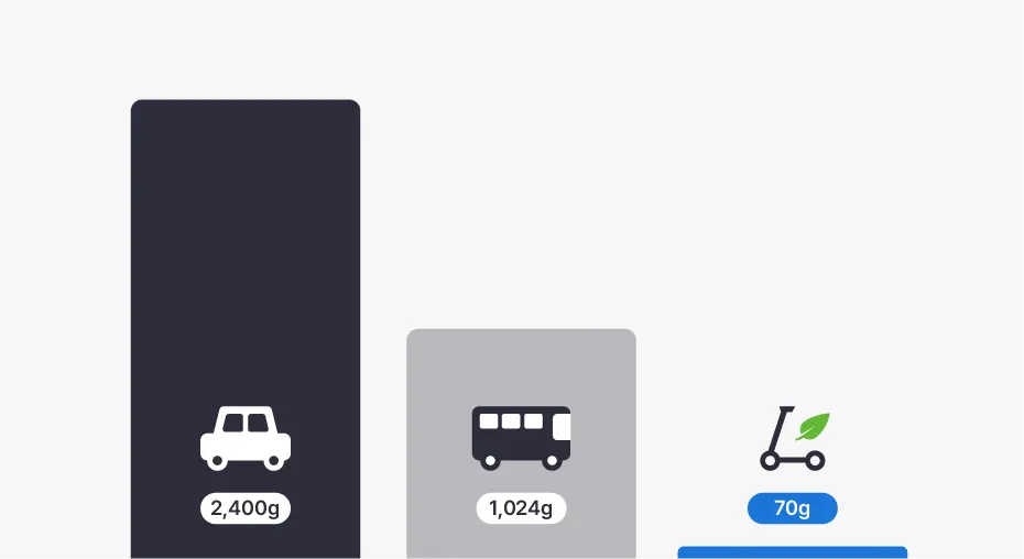 자동차는 2,400g의 탄소를, 버스는 1,024g의 탄소를 배출하는 반면 킥보드는 70g의 탄소를 배출합니다. 씽씽은 이미 지속 가능한 도시를 위해 행동하고 있어요.